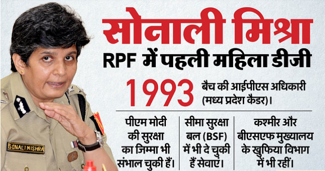 केंद्रीय कैबिनेट की नियुक्ति समिति ने 1993 बैच की मध्य प्रदेश कैडर की वरिष्ठ IPS अधिकारी सोनाली मिश्रा को रेलवे सुरक्षा बल (RPF) का महानिदेशक (DG) नियुक्त किया है। यह भारतीय रेलवे के इतिहास में एक ऐतिहासिक क्षण है, क्योंकि सोनाली मिश्रा इस पद पर नियुक्त होने वाली पहली महिला अधिकारी हैं। वह 31 जुलाई 2025 को सेवानिवृत्त होने वाले वर्तमान डीजी मनोज यादव की जगह लेंगी और 31 अक्टूबर 2026 तक इस पद पर कार्यरत रहेंगी।